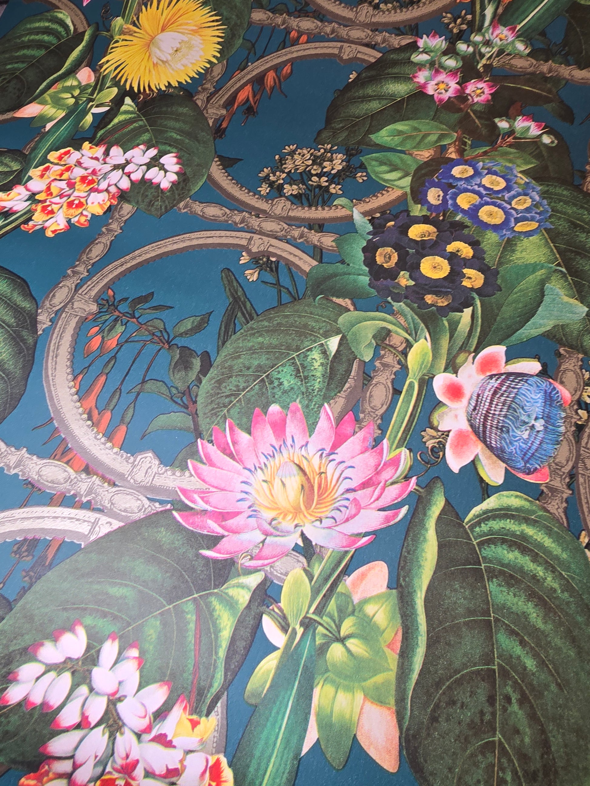 This design blends rich teal tones with ornate Baroque-style frames and vibrant oversized florals, creating a dramatic, high-end feature wall that instantly transforms any room.