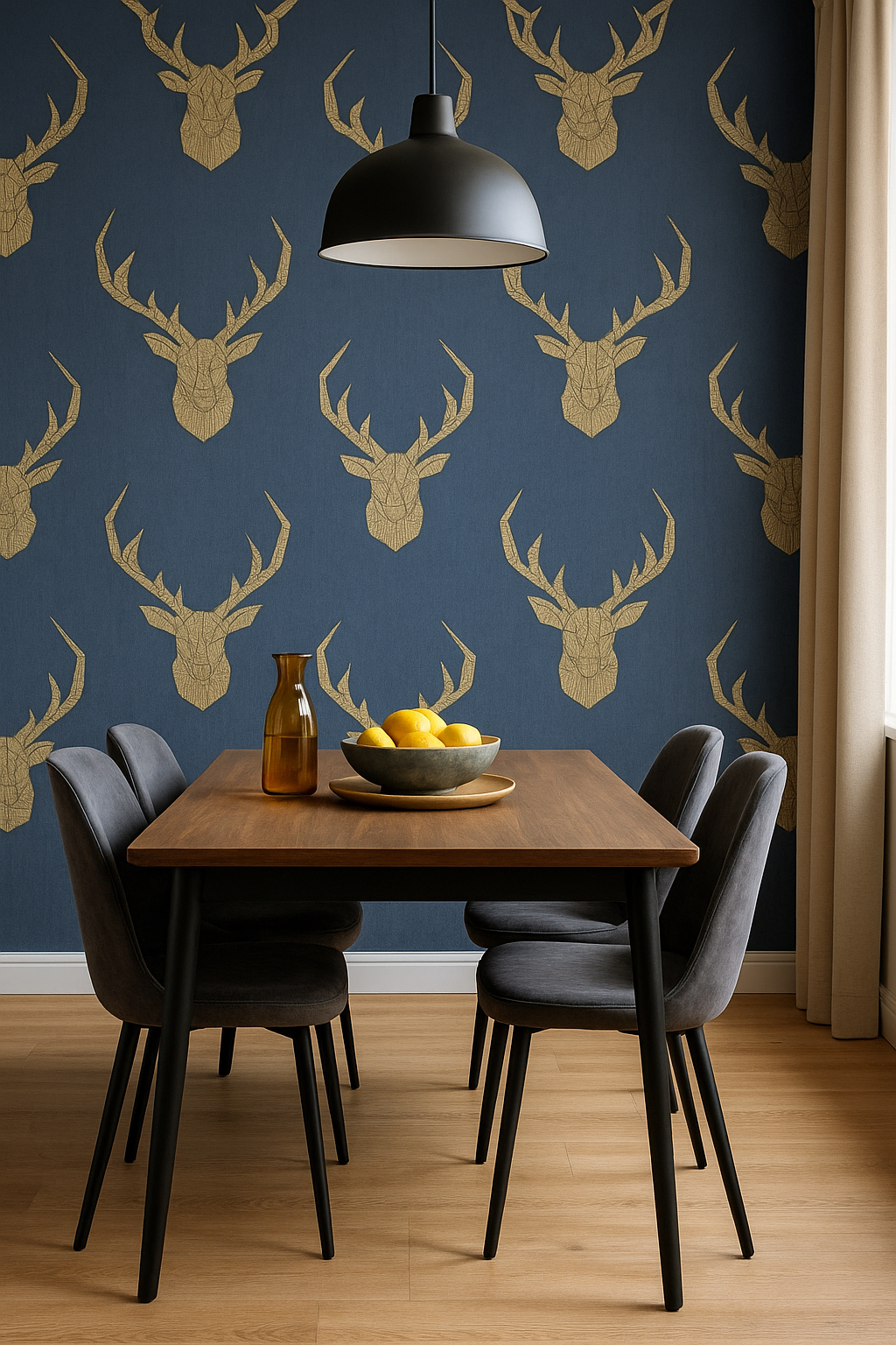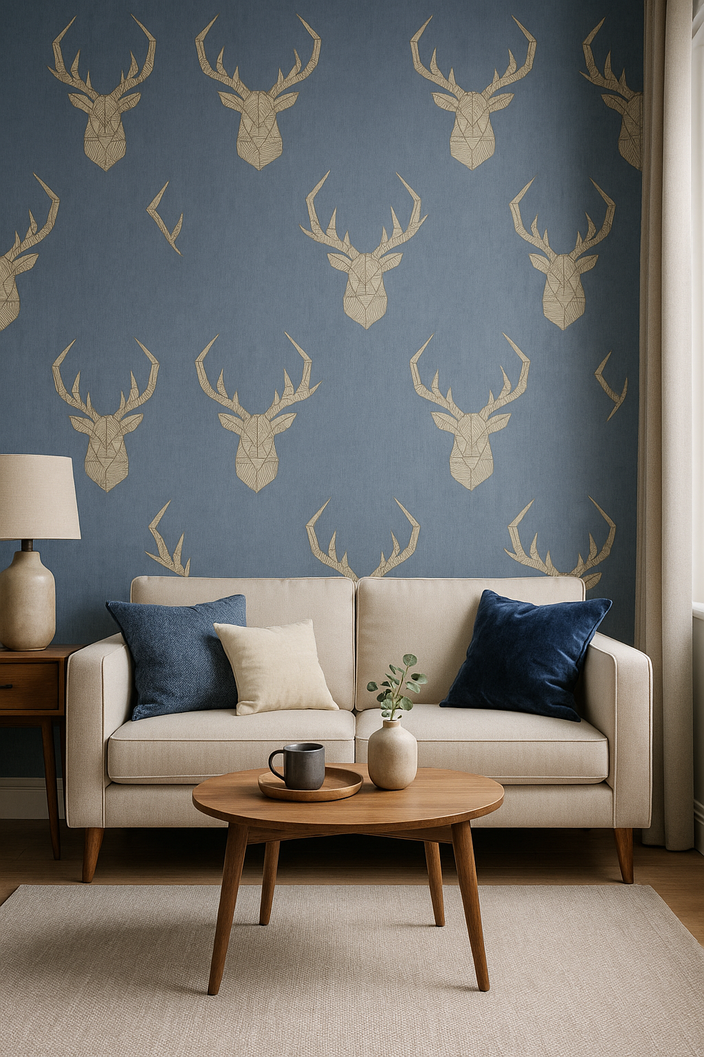 Blue & Gold Geo Stag Wallpaper – Modern Feature Wall 🦌
