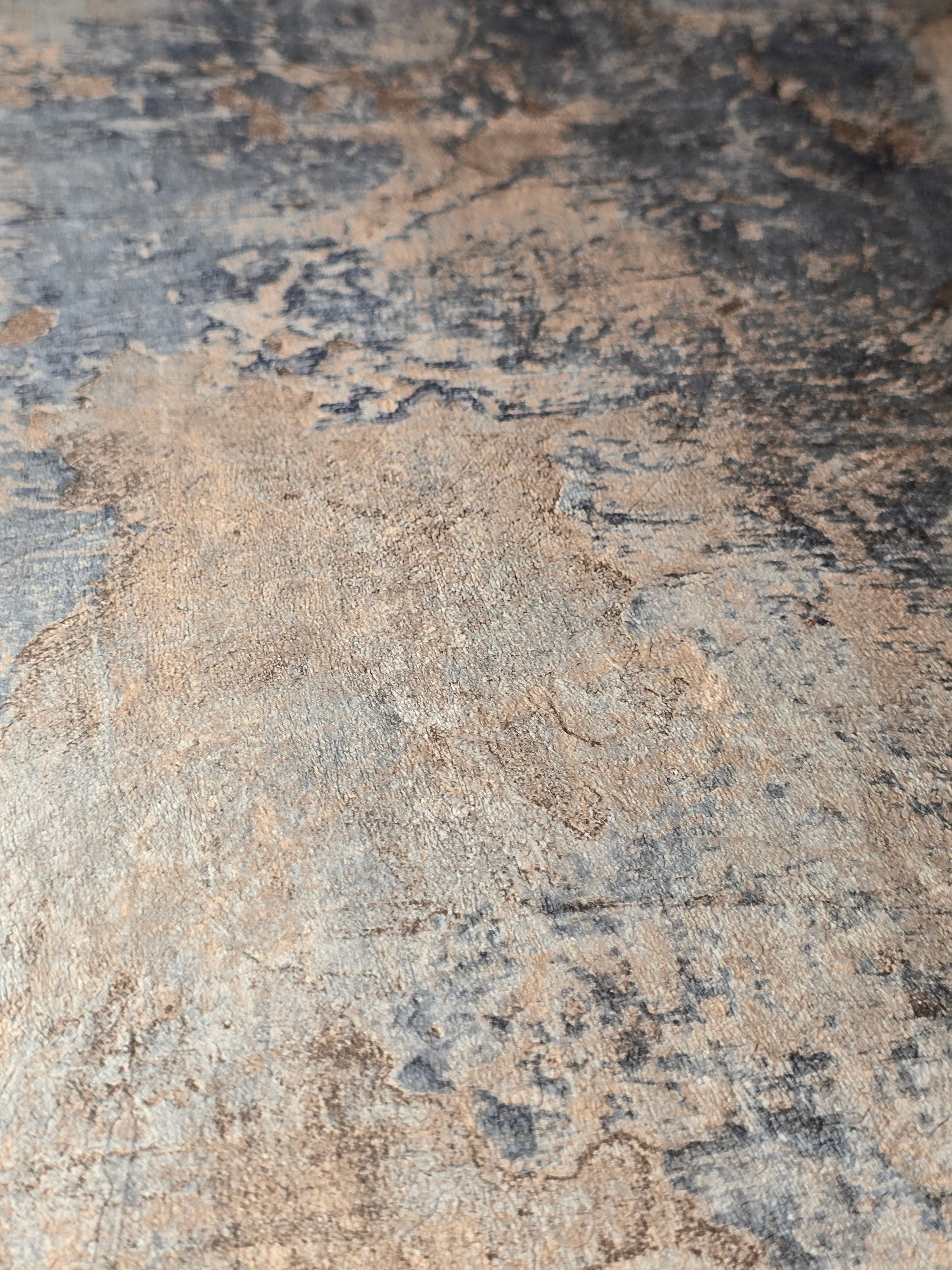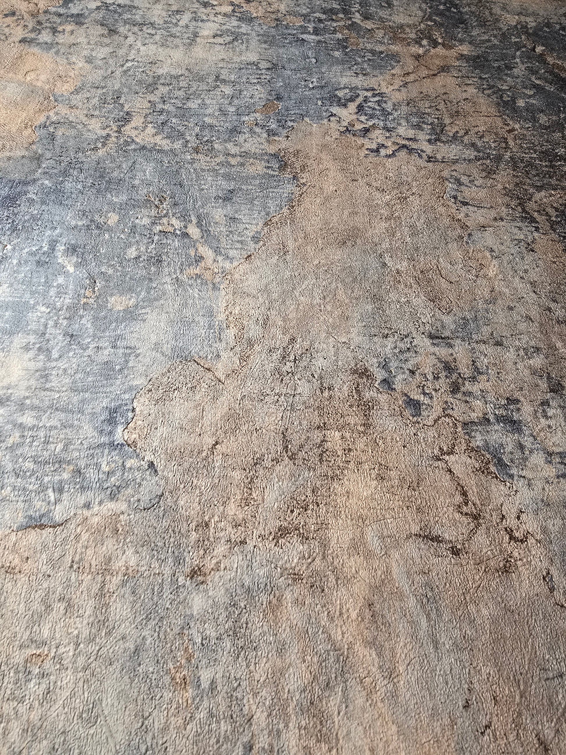 This design features a textured plaster-effect pattern in layered tones of navy, stone and slate, creating a soft industrial look that’s stylish and calming.