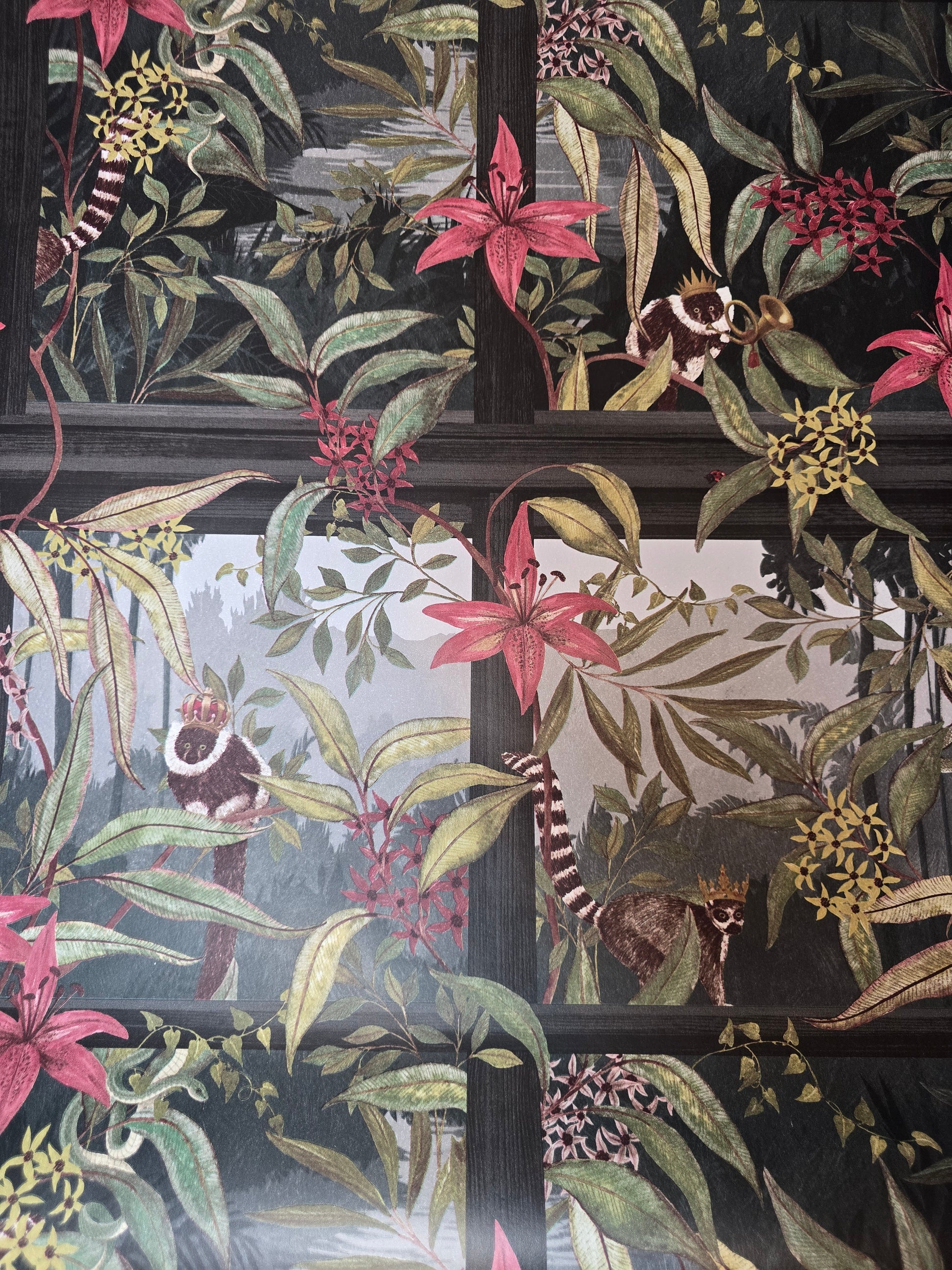 This stunning design features exotic foliage, blooming lilies, and adorable crowned lemurs hidden among the leaves — perfect for creating a bold, dramatic feature wall.
