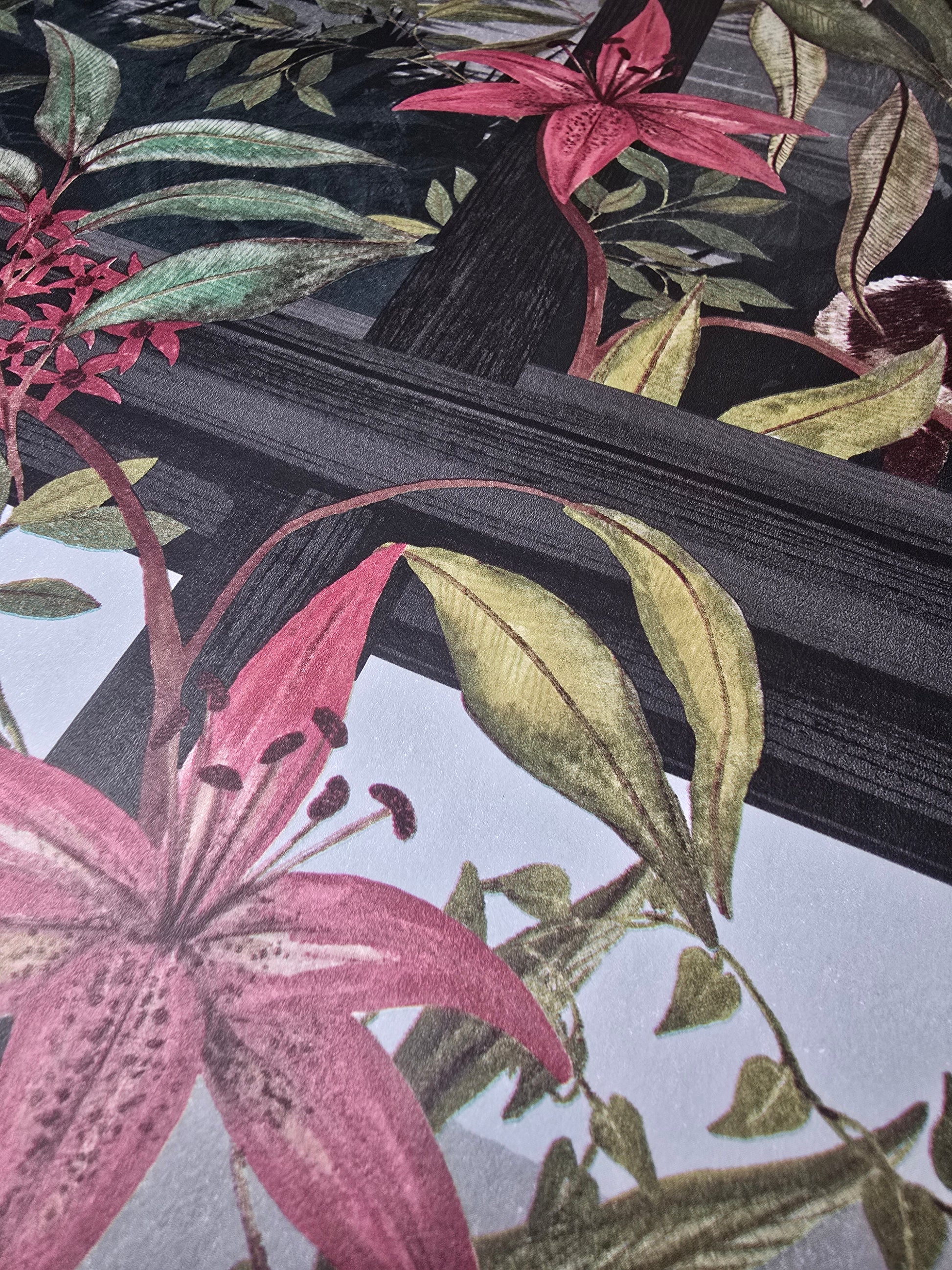 Rich charcoal tones contrast beautifully with greens, golds and deep reds, giving this wallpaper a premium “designer look”.