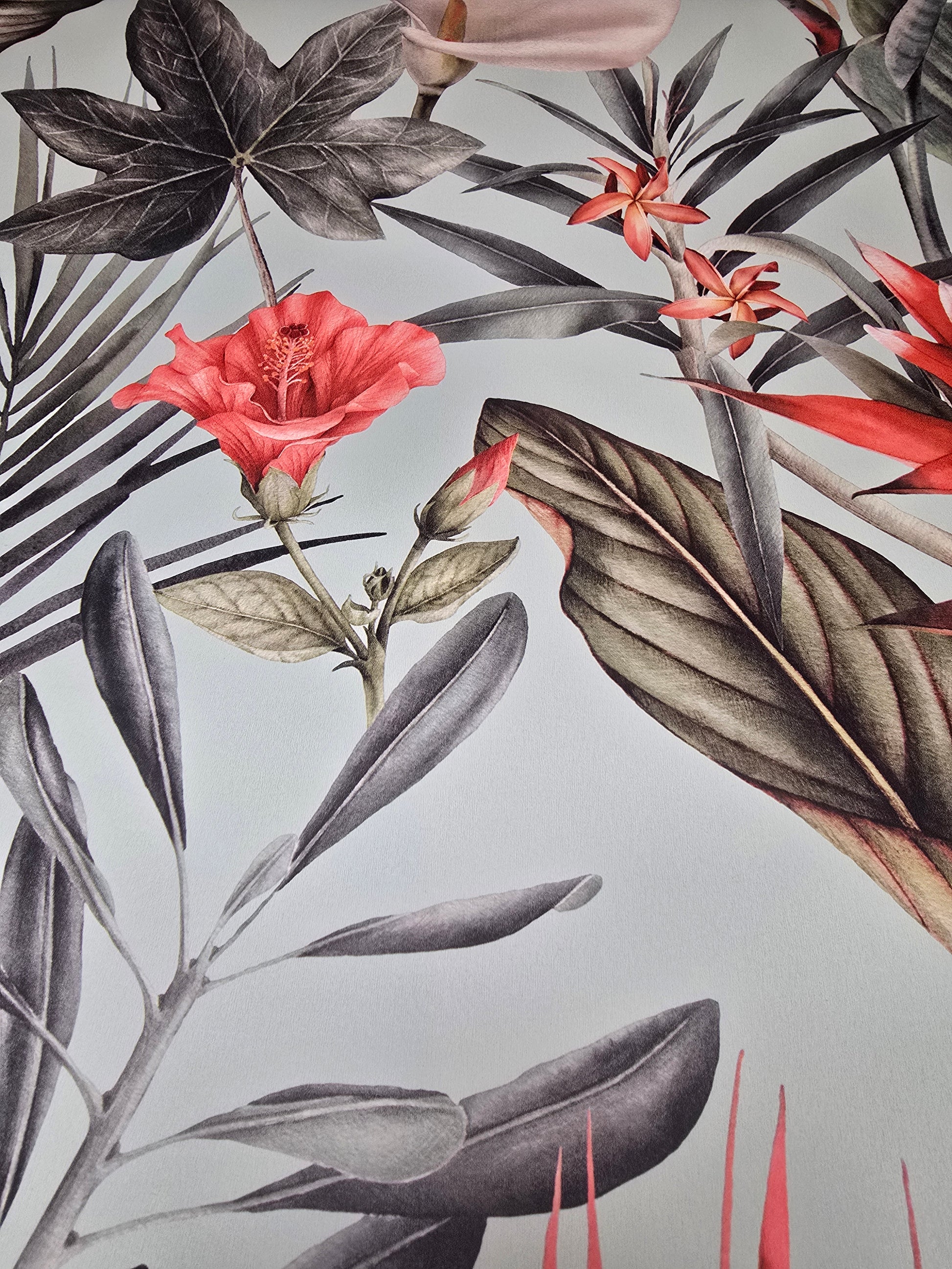 The soft watercolour-style design gives a luxurious, hand-painted feel and works perfectly in living rooms, bedrooms, dining rooms, hallways and feature walls. The light background keeps the room feeling bright while the bold tropical florals add colour and personality.