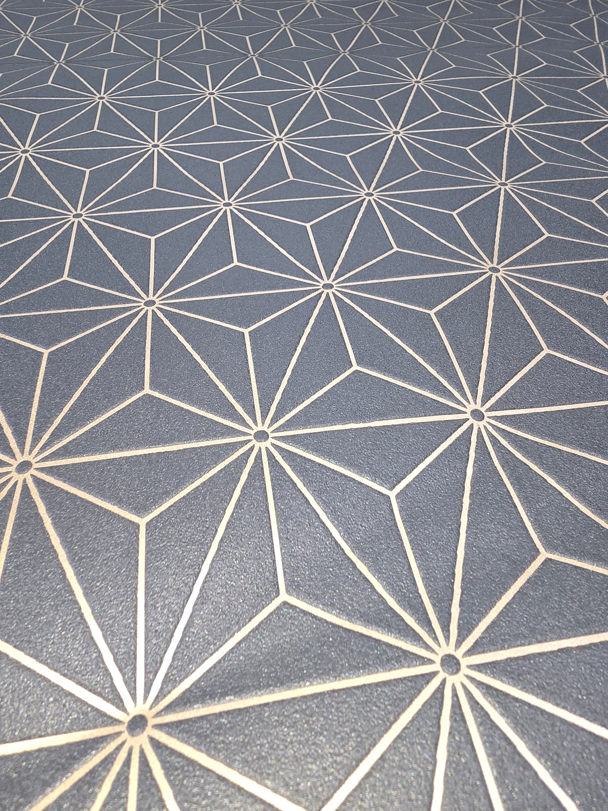 Featuring a sleek dark charcoal background with shimmering gold star-like patterns, this wallpaper brings modern elegance and sophistication to any room.