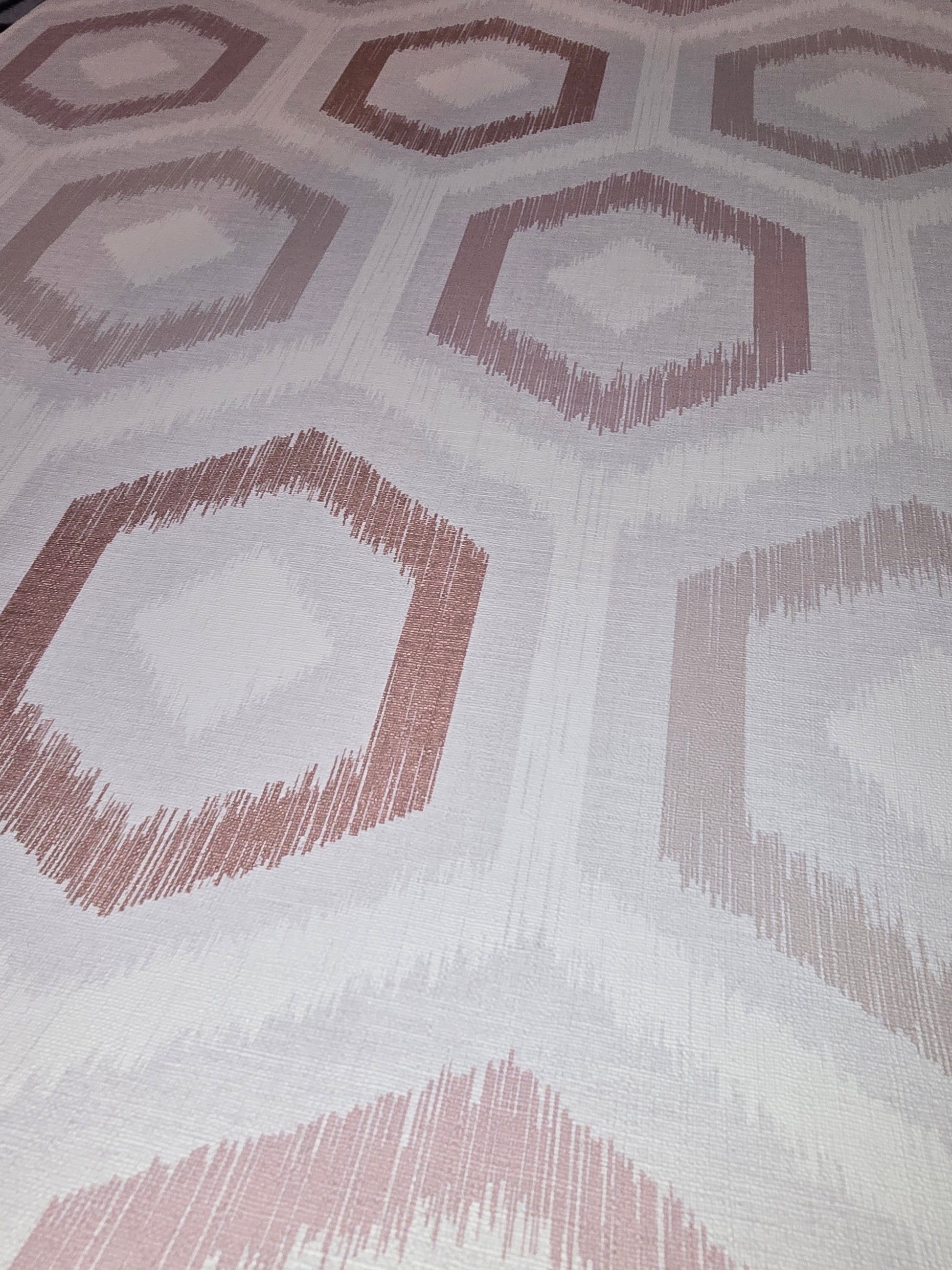 Add a modern touch of elegance to your home with this stunning Ikat Geo Blush Wallpaper. Featuring a bold geometric hexagon pattern in soft blush pink tones with a textured vinyl finish, this wallpaper creates a stylish and contemporary feature wall. Perfect for living rooms, bedrooms, or hallways, it combines subtle shine with a durable, wipeable surface.