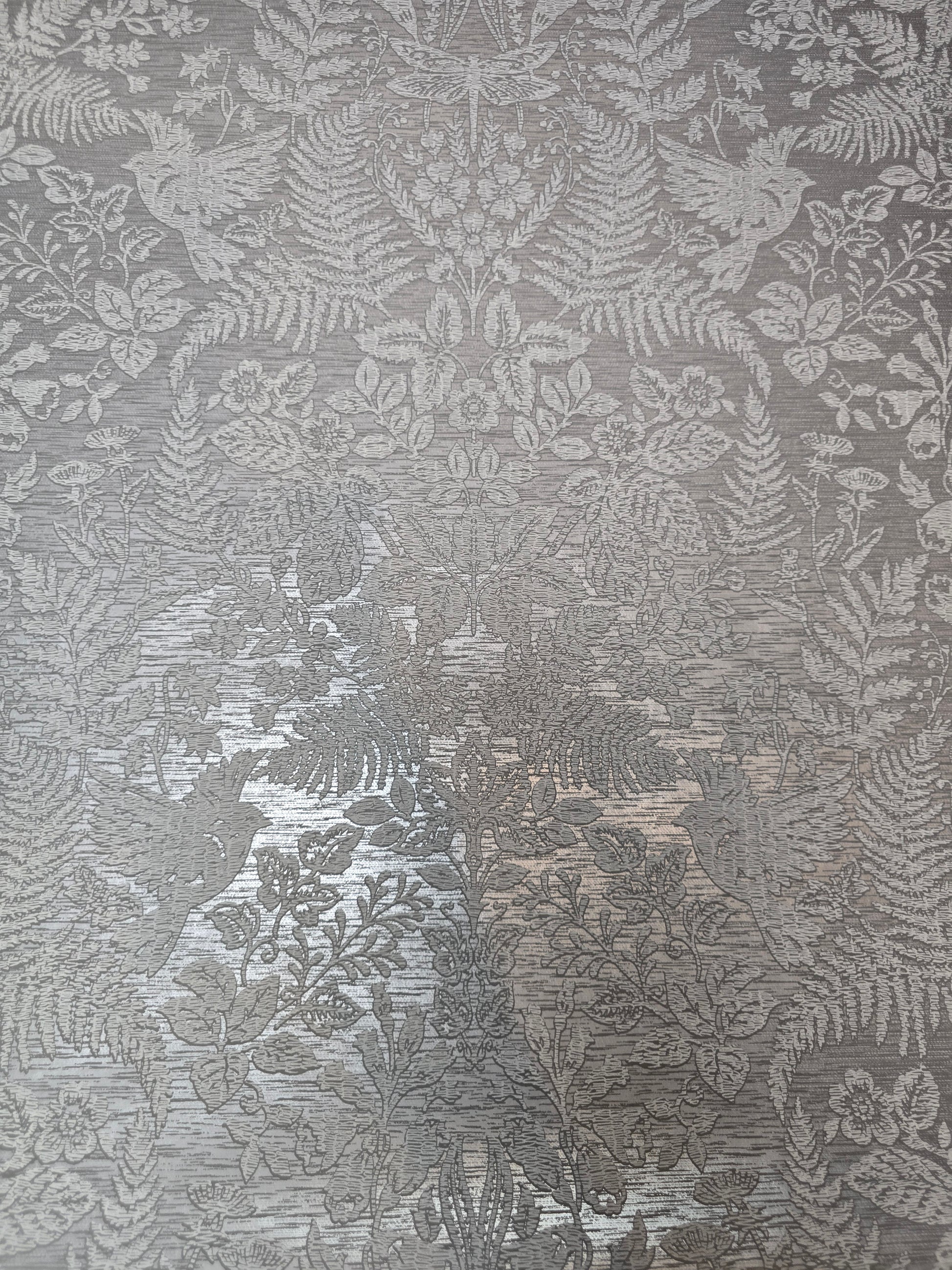 This stunning premium-vinyl design blends a soft grey wood-effect background with raised textured botanicals, ferns, florals and delicate birds. The subtle shimmer catches the light beautifully, giving a luxury designer look without overpowering the room.