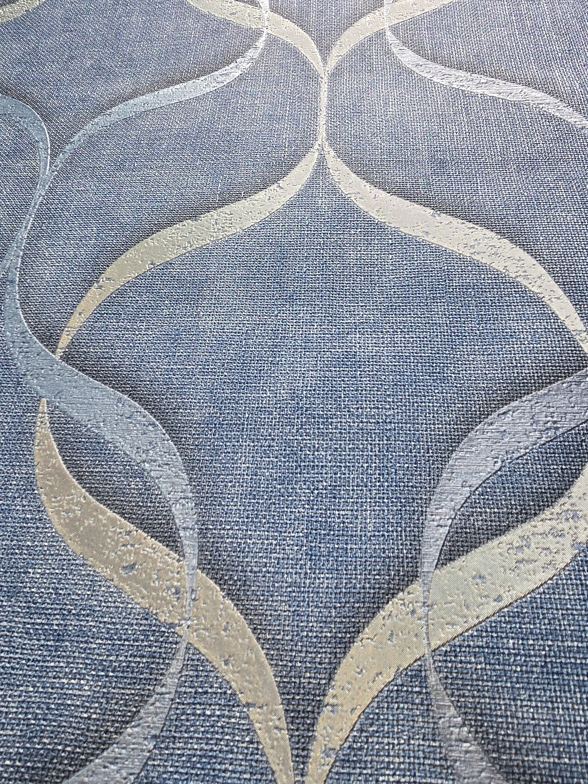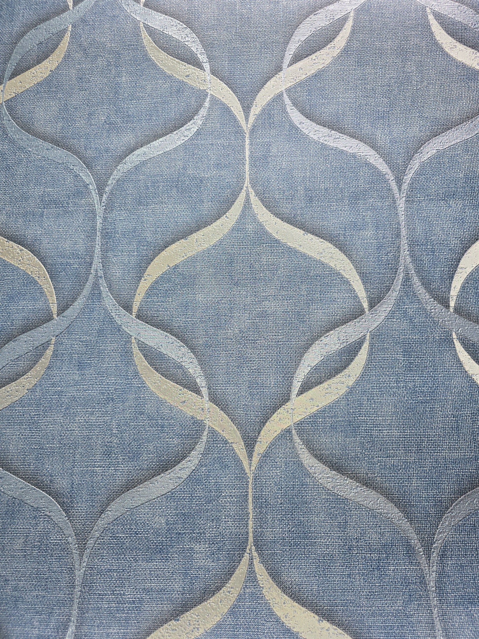 Transform your walls with this stunning Vymura luxury vinyl wallcovering, featuring a modern interlocking wave pattern in shimmering silver tones set against a textured denim-blue background. The metallic highlights catch the light beautifully, adding depth and elegance to any room.