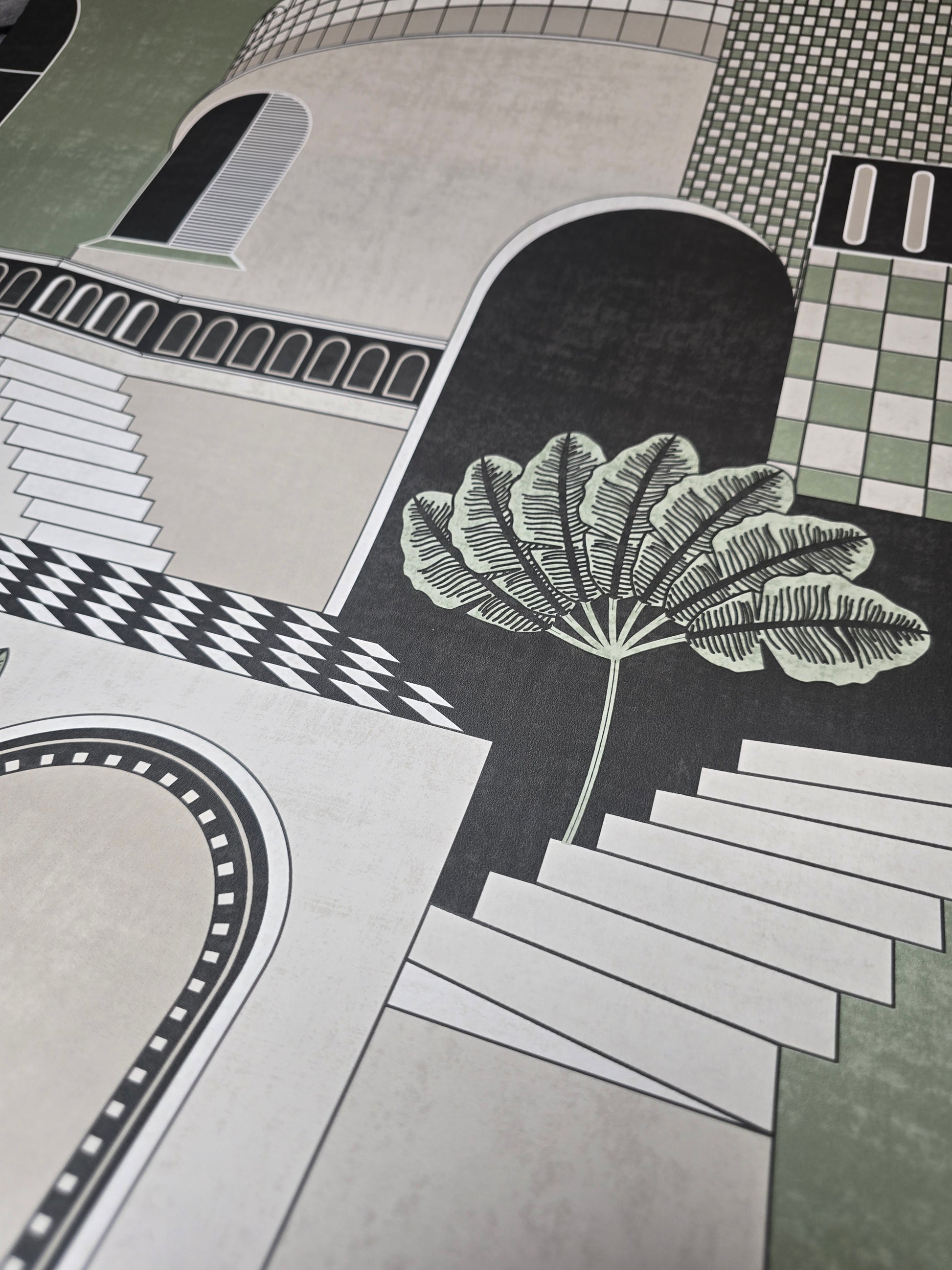 Featuring surreal staircases, archways, geometric blocks and botanical details, this design brings a modern “art house” vibe to any room.