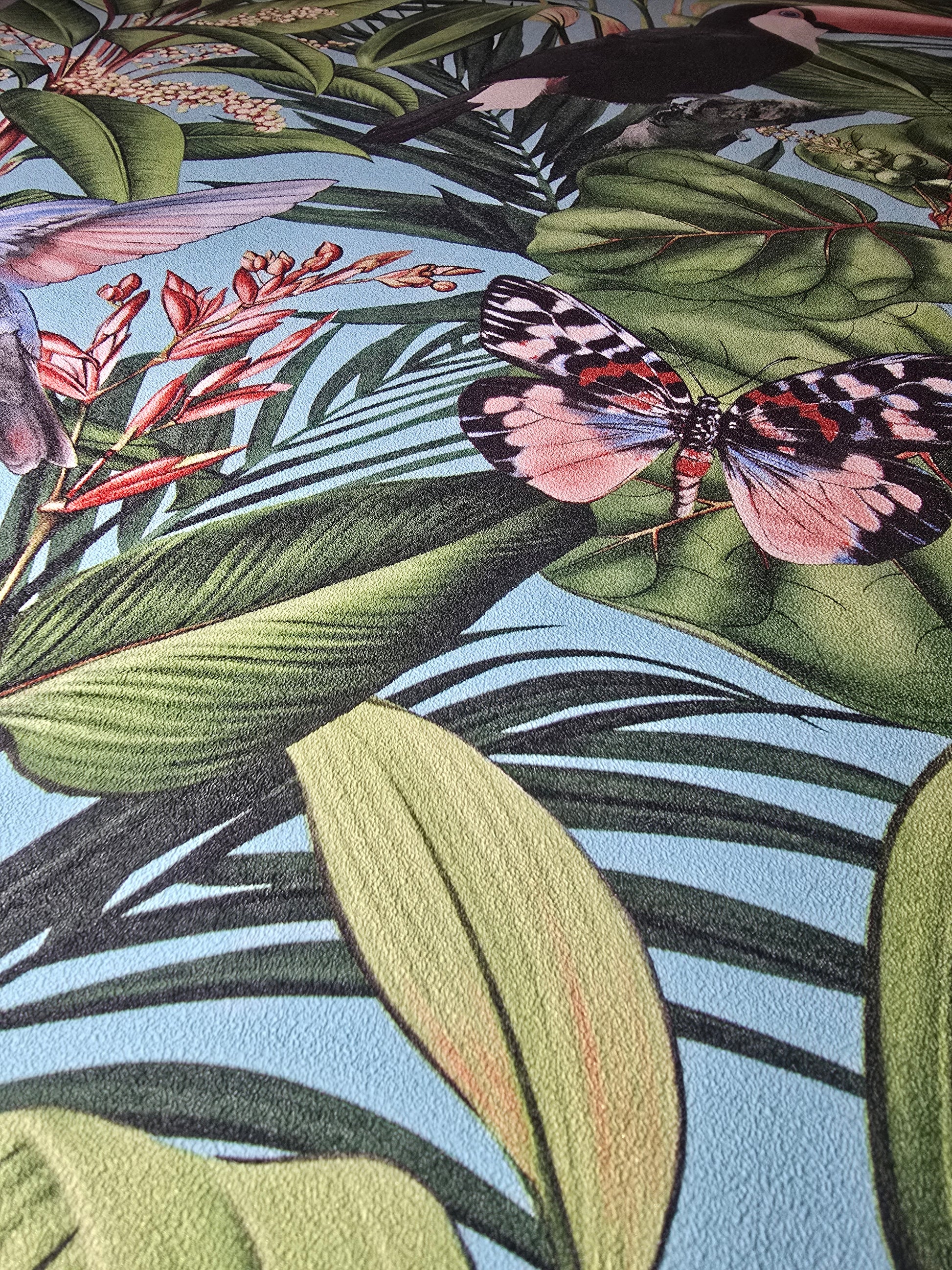 Bring the tropics into your home with the Erisman Select Paradisio 2 Wallpaper. Featuring vibrant toucans, butterflies, and lush green leaves set against a serene blue background, this design adds instant colour and energy to any space.