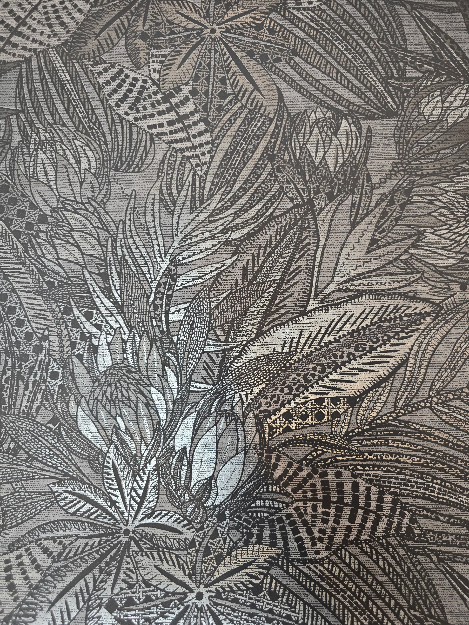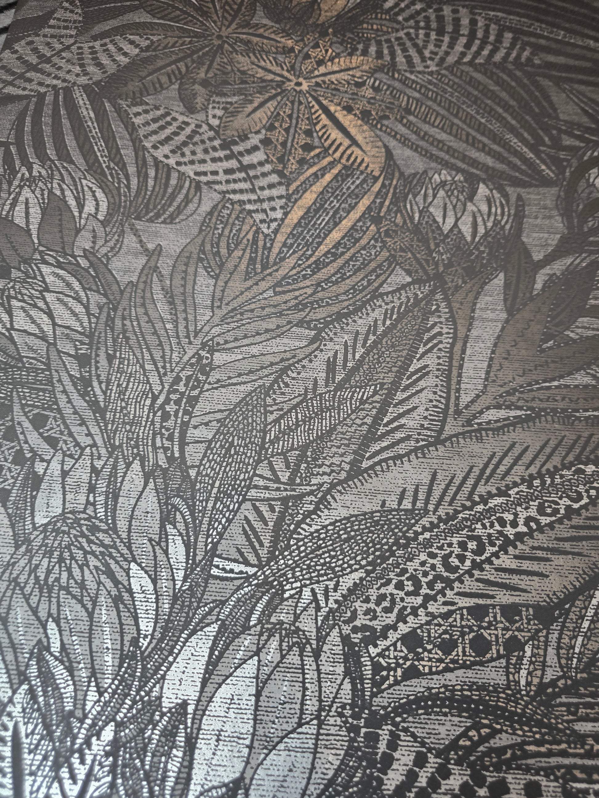 Featuring metallic highlights, hand-drawn botanical detailing and rich charcoal tones, this wallpaper creates a high-end feature wall that feels both dramatic and elegant.