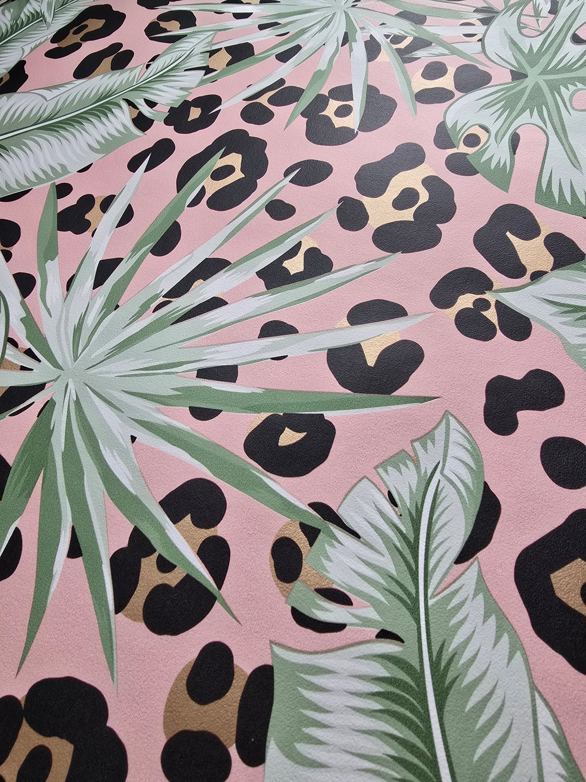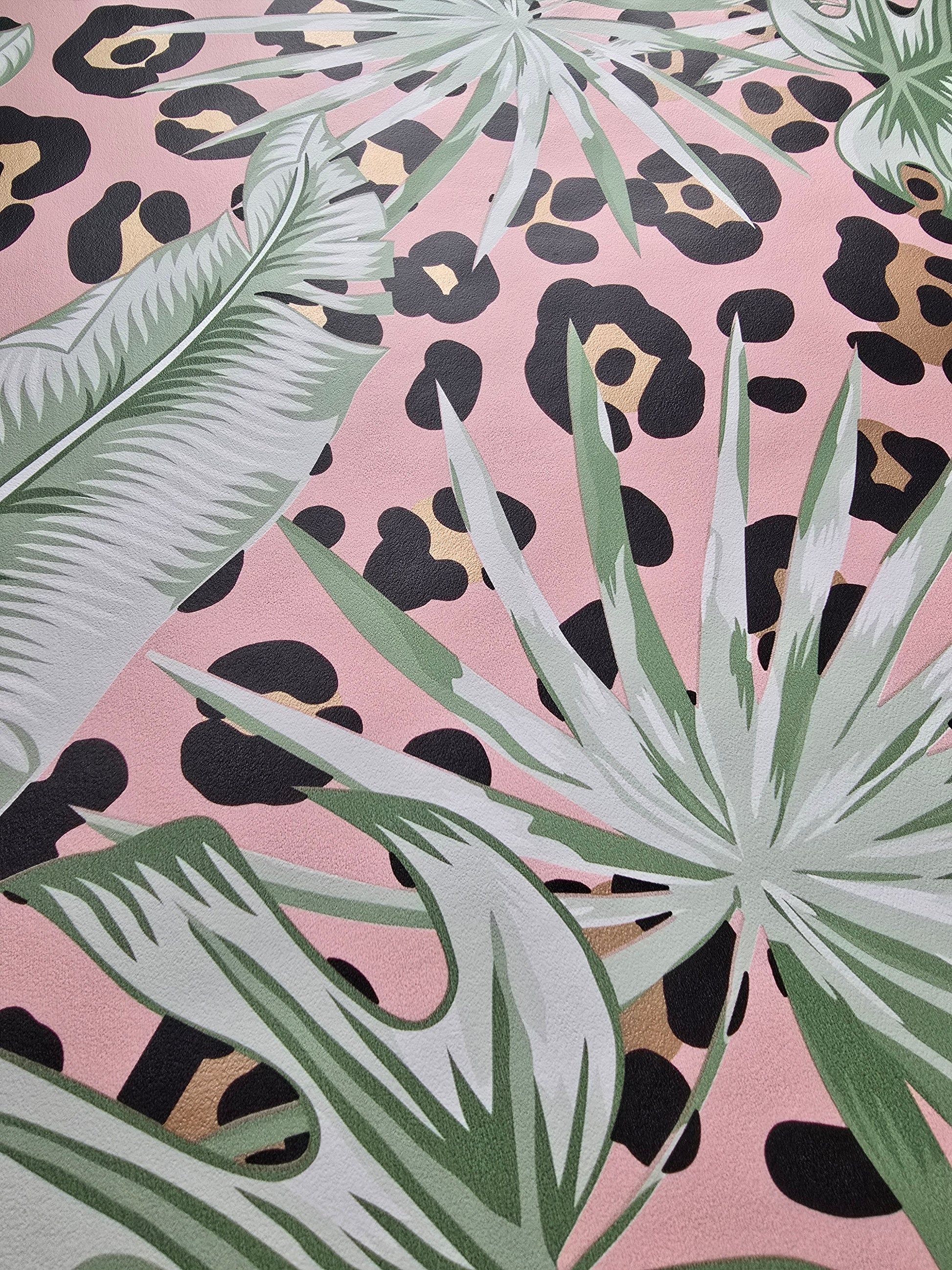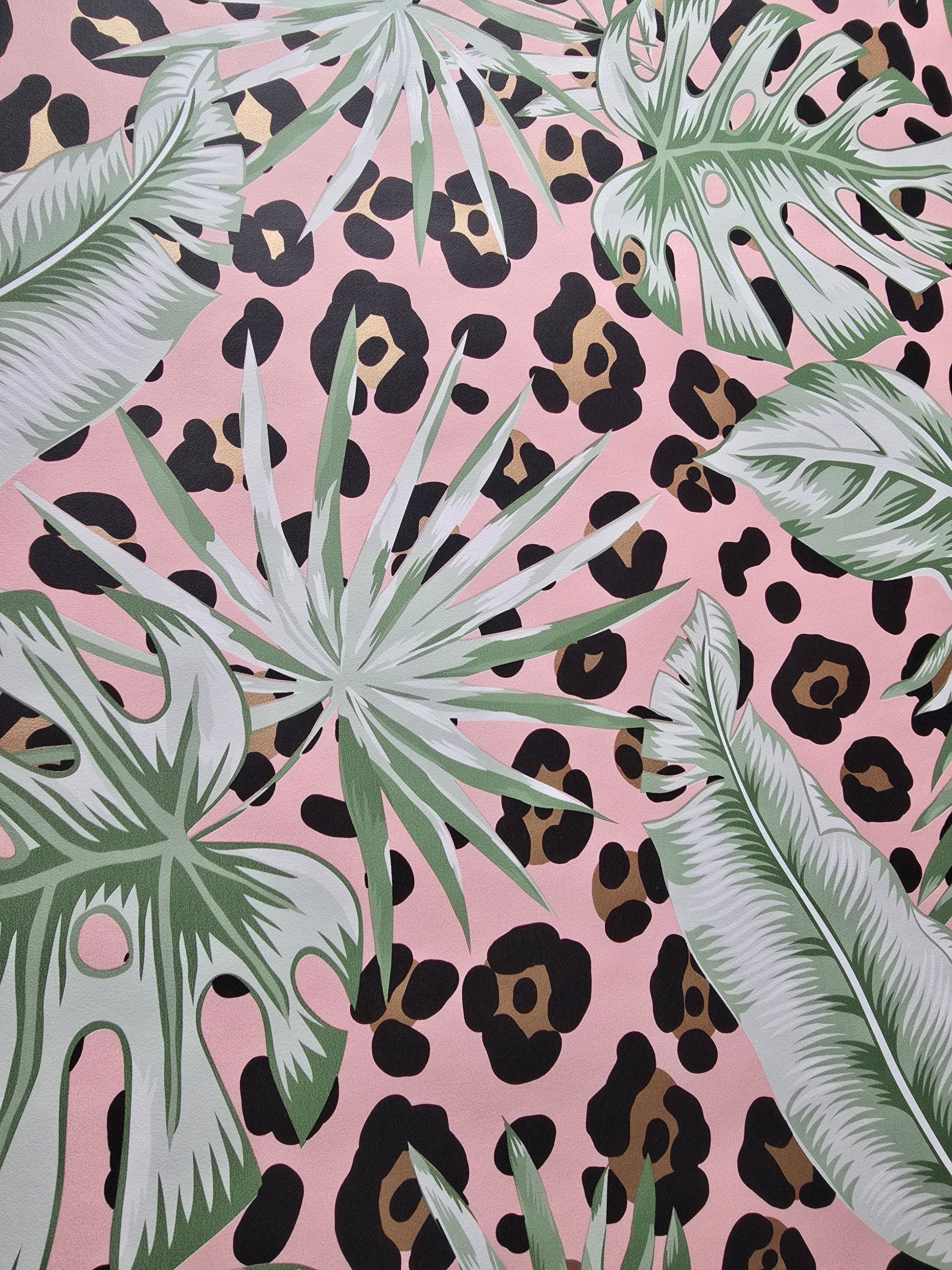 Featuring a playful mix of soft pink tones, tropical palm leaves and leopard print, this design is perfect for creating a standout feature wall with a modern, trendy vibe.